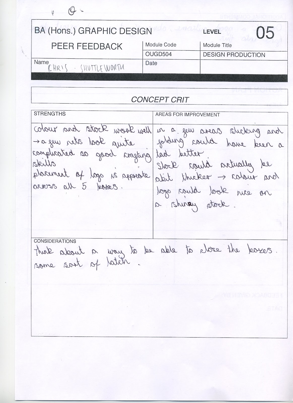 - Colours and use of design- could have used colour more effectively- make sure that printing onto different stock doesn't affect the colours.